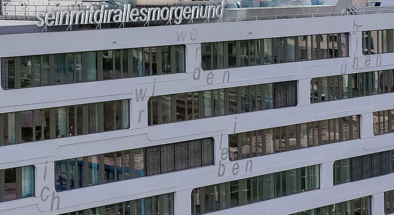 Die Setzung der Texte an der Fassade nimmt den Bewegungs/Rhythmus der Fassade auf.